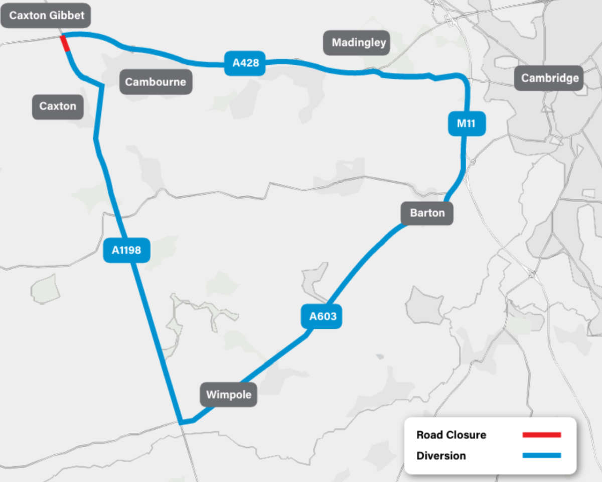 A contraflow system is being installed on the A428 east of Caxton Gibbet roundabout towards Cambourne. To allow work to take place safely, the A428 will be fully closed in both directions from 8pm Friday 3 October to 6am Monday 6 October 2025.
