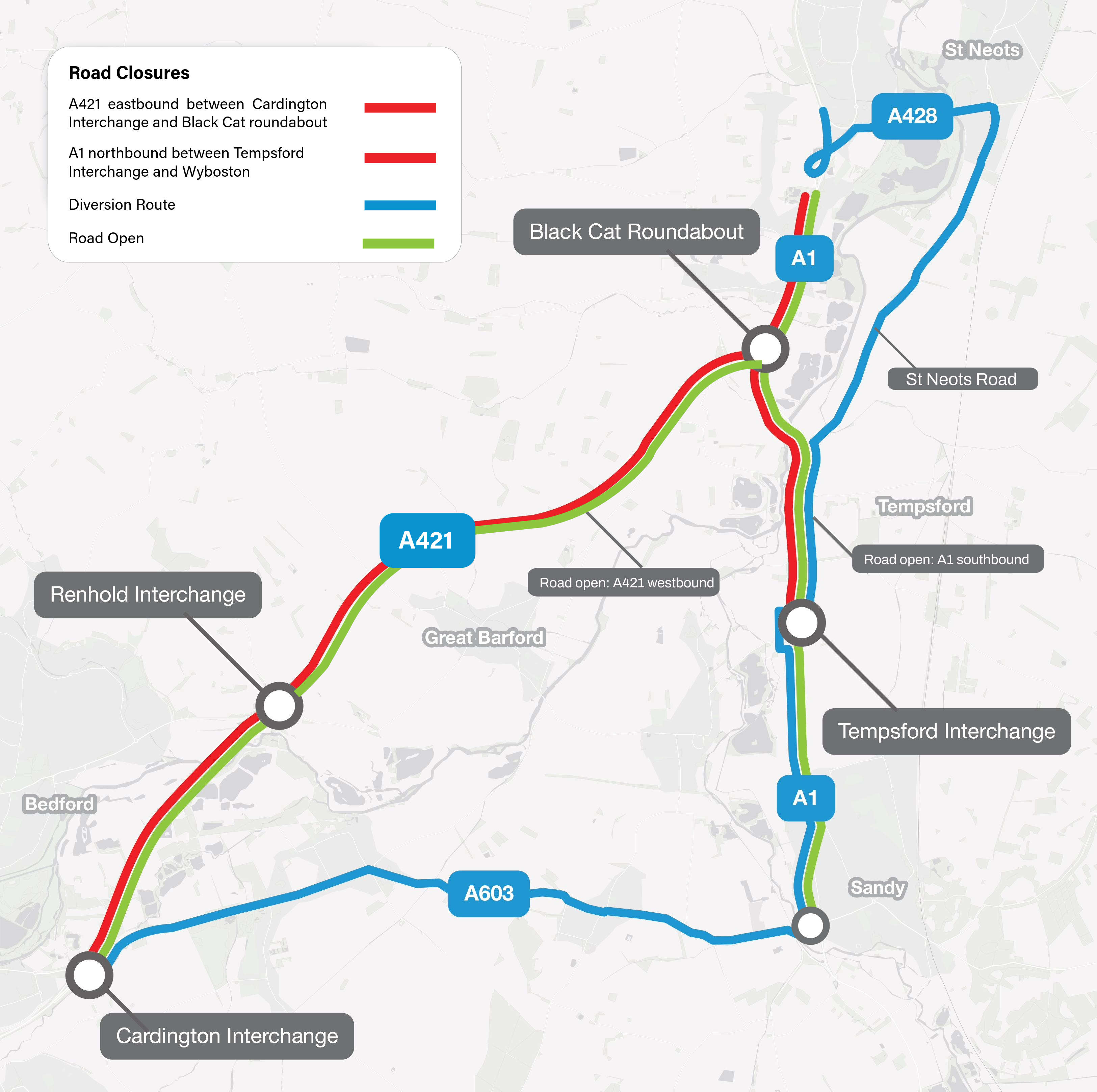 Further work is planned on the A421 eastbound near Black Cat roundabout to install new safety barriers and lighting. In addition, Anglian Water will connect a new water main on Nags Head Lane near the A1 carriageway.