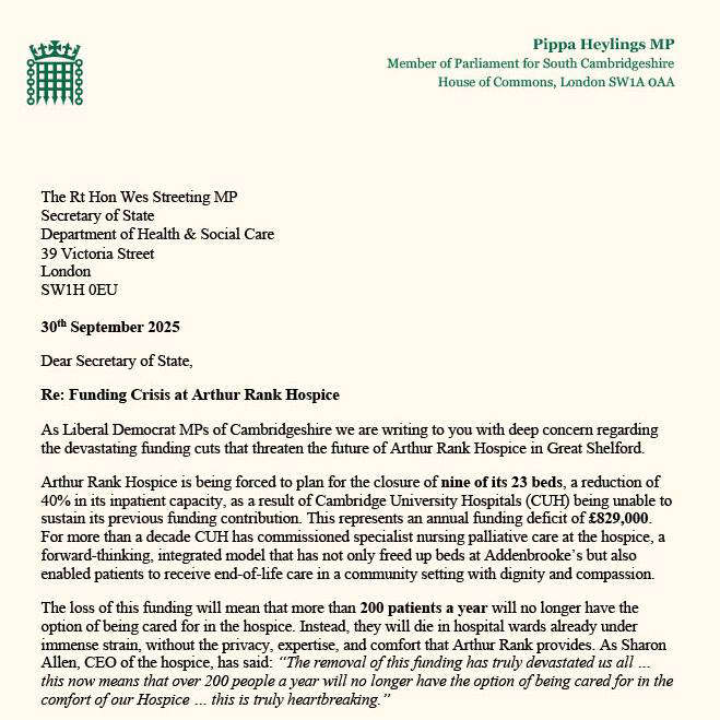 South Cambridgeshire MP Pippa Heylings has also written to Secretary of State for Health Wes Streeting urging the Government to protect funding for the hospice.
